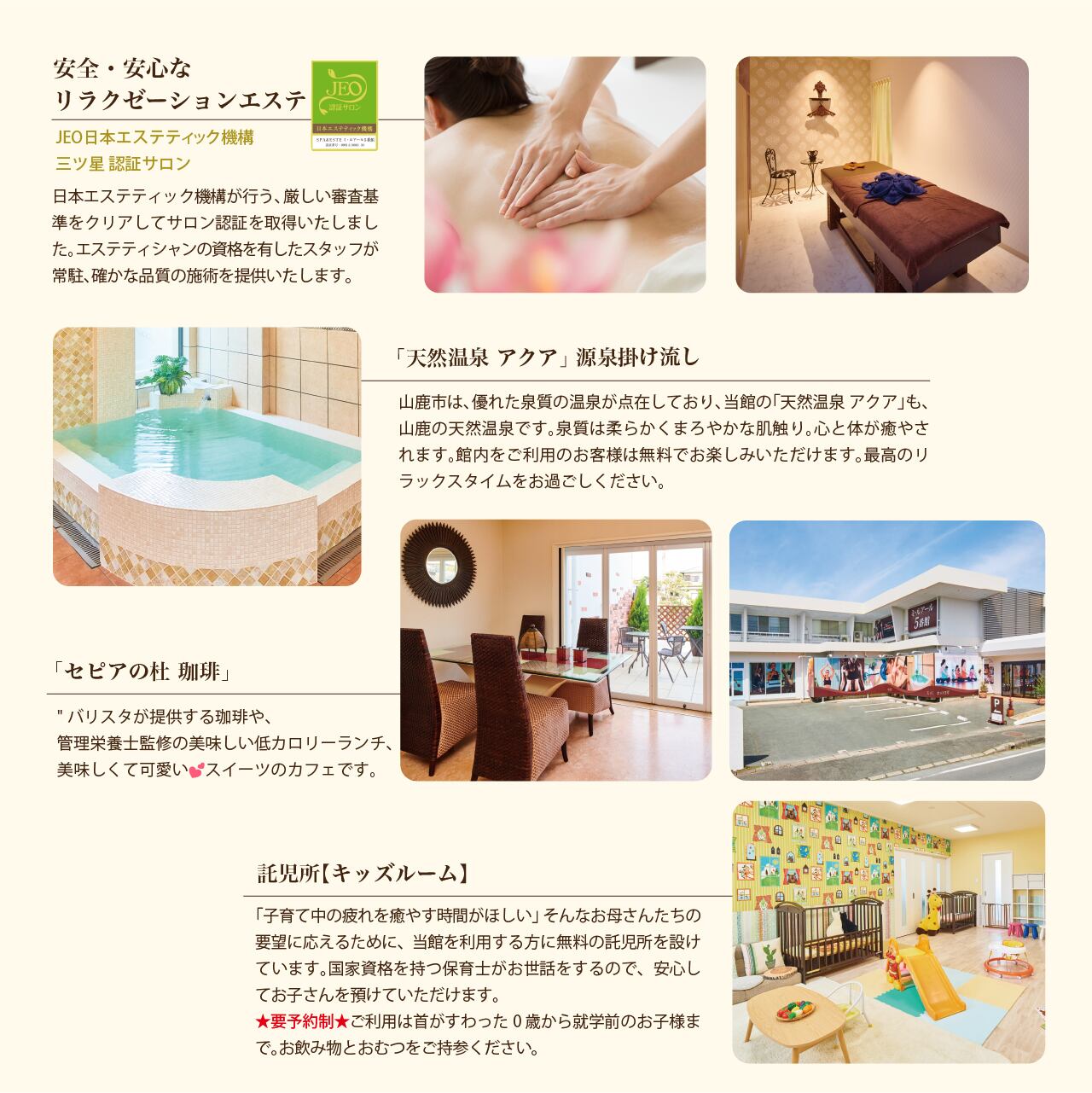 ■駐車場、天然温泉、託児所、カフェ、水素サーバー すべて無料でご利用いただけます。